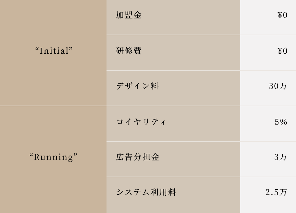現在加盟金¥0、ロイヤリティ5%で募集しております。今後加盟者様が増えた場合、加盟金やロイヤリティは上げさせていただく予定です。